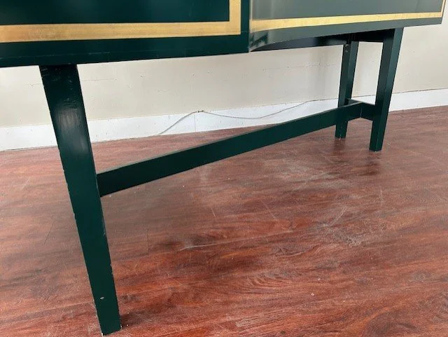 Case finish: dark green exterior, red interior, with gold banding on the case and on the inside of the lid and flap