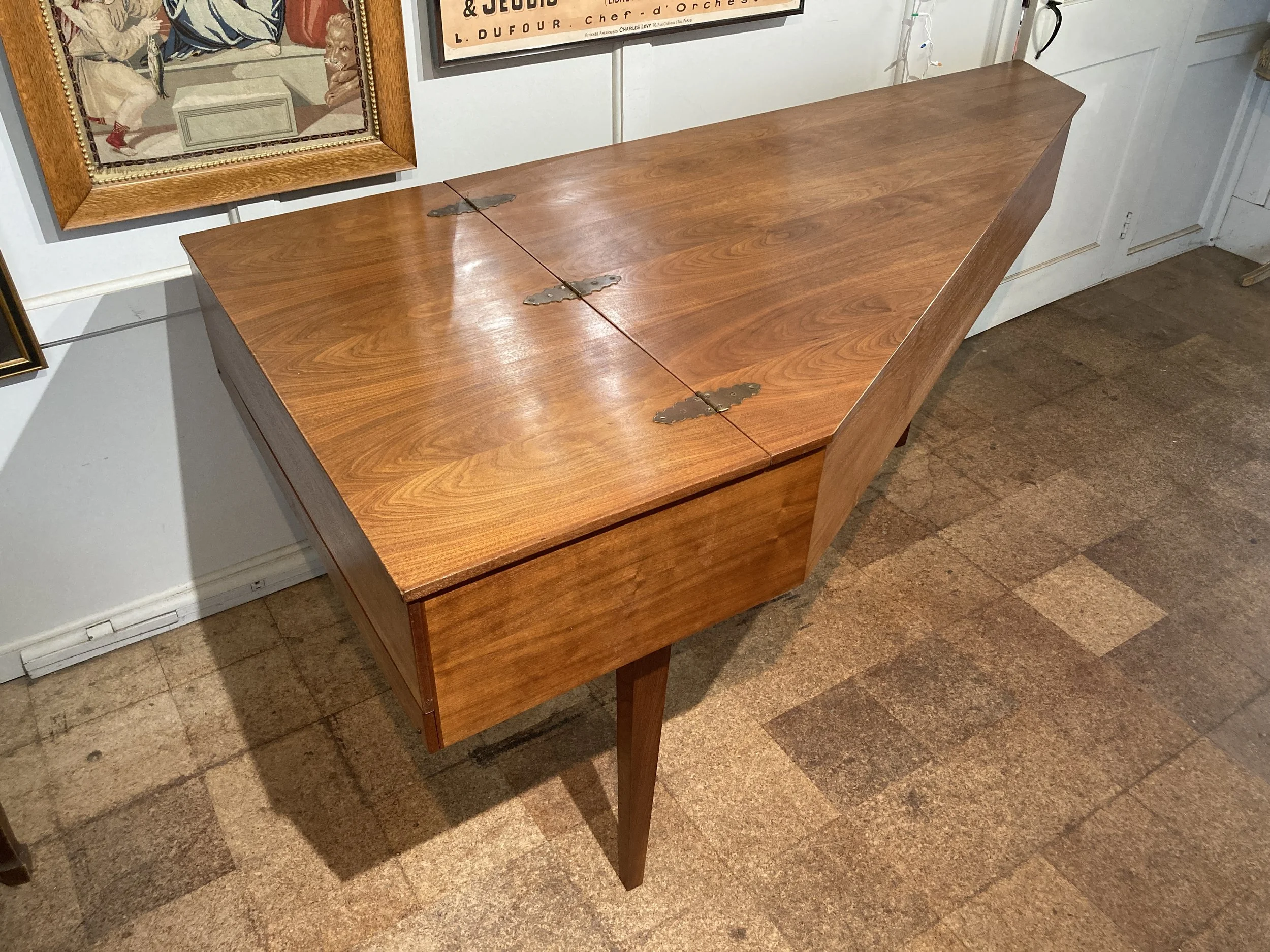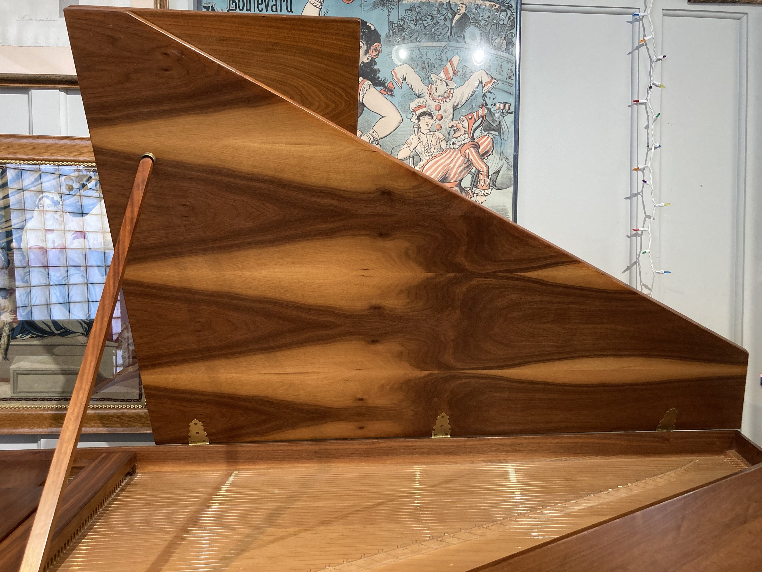 Case is walnut-veneered with a book-matched pattern on the lid.